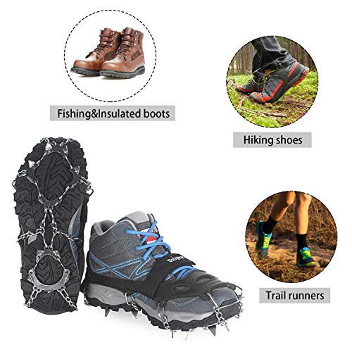 - Balance Enhanced - feature 18 spikes per foot, with 12 spikes at the forefoot and 6 spikes at the heel. Each wide heel plate with 3 spikes is for secure downhill traction and each spike is 1/2” long. The spikes are made from heat-treated stainless steel for excellent durability and corrosion resistance.
