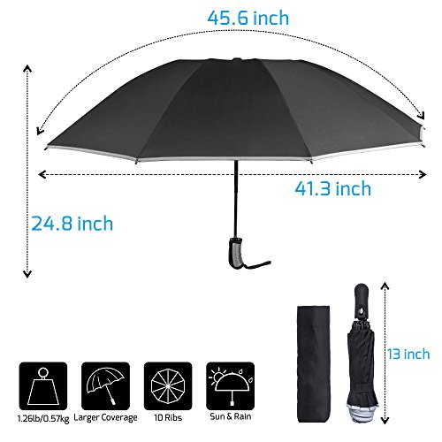 - ☂Portable: Trifold to 12.6 inch (32cm), 1.05LB (476.8g) weight with 46 inch arc coverage, convenient for you to keep it in your backpack briefcase, travel bag, luggage or car for unexpected downpour, This Rain Umbrella is a good choice as gift for your family or friends